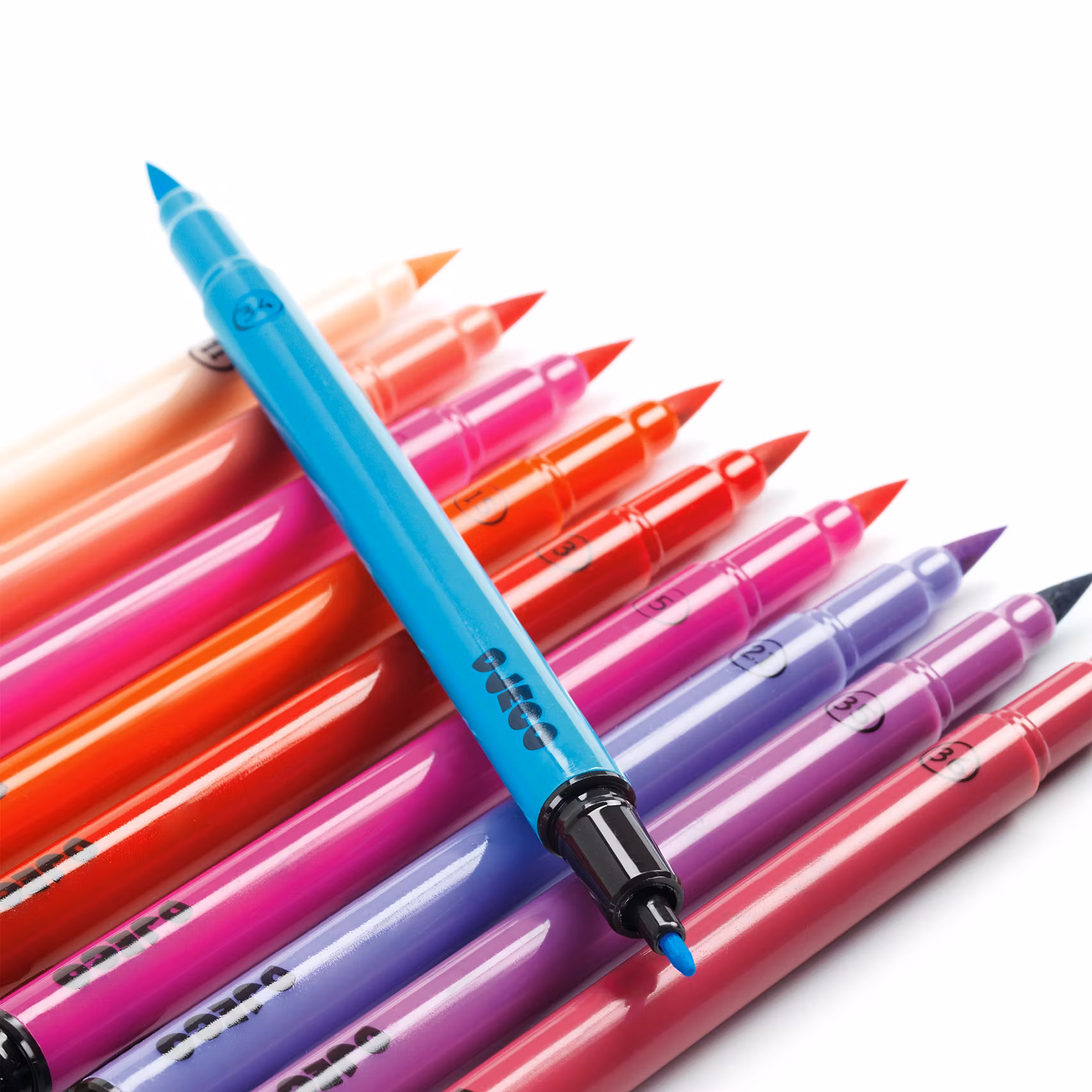 Pennorna har en spets som är smal och fast samt en spets som är mjuk och pensel-lik för att göra streck med varierande bredd och fylla i större ytor.