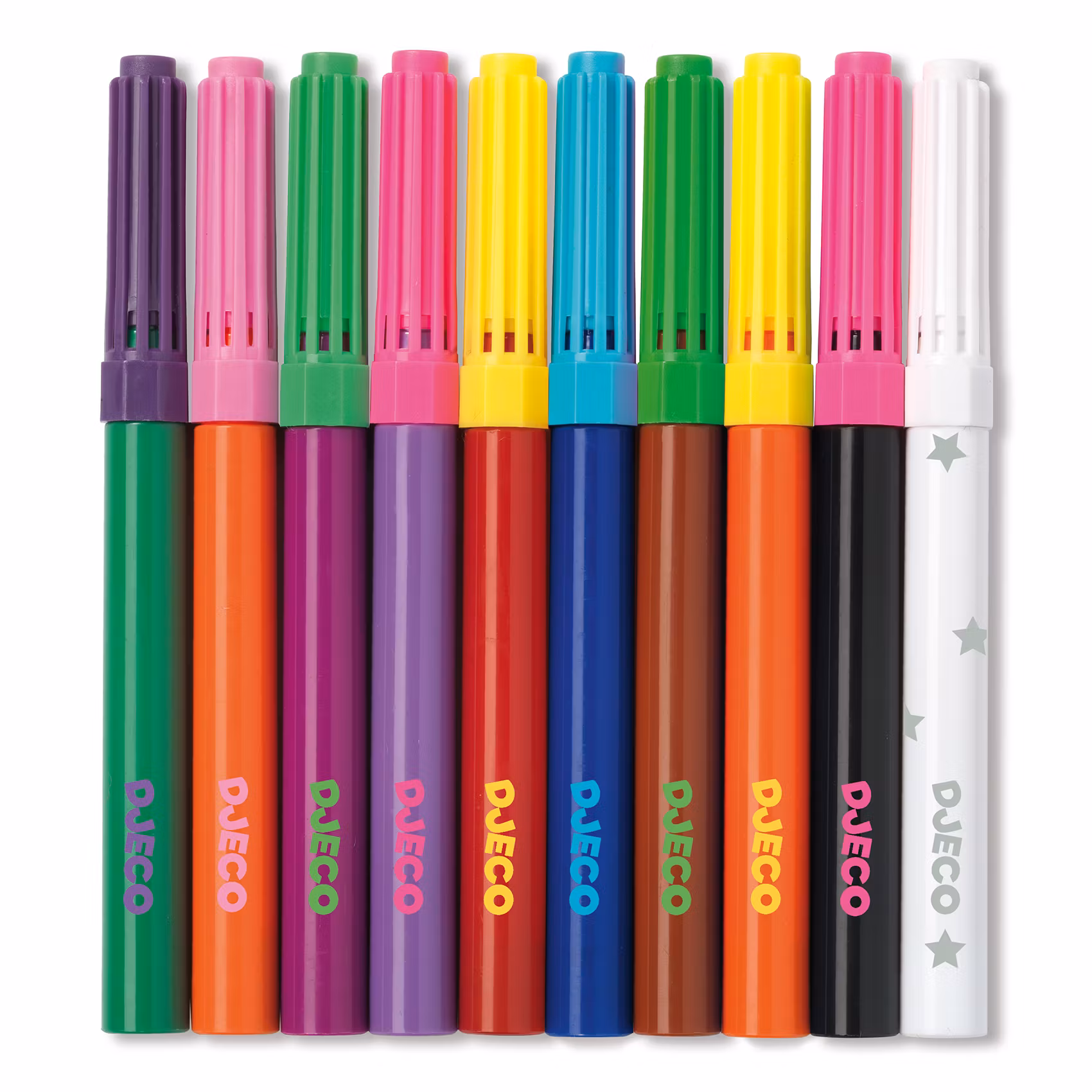 Färgen på filtpennornas skaft anger den första färgen och färgen på korken samt Djecos logga anger vilken färg det kommer att bli med hjälp av den magiska pennan.