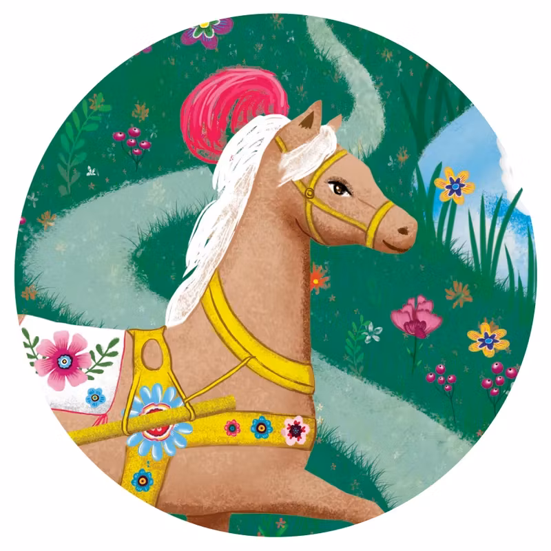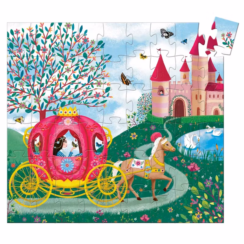 Ett fantasifullt 54-bitars pussel med ett vackert motiv av en vacker svarthårig prinsessas häst och vagn på väg till ett elegant slott- en perfekt bild att hitta på berättelser om.