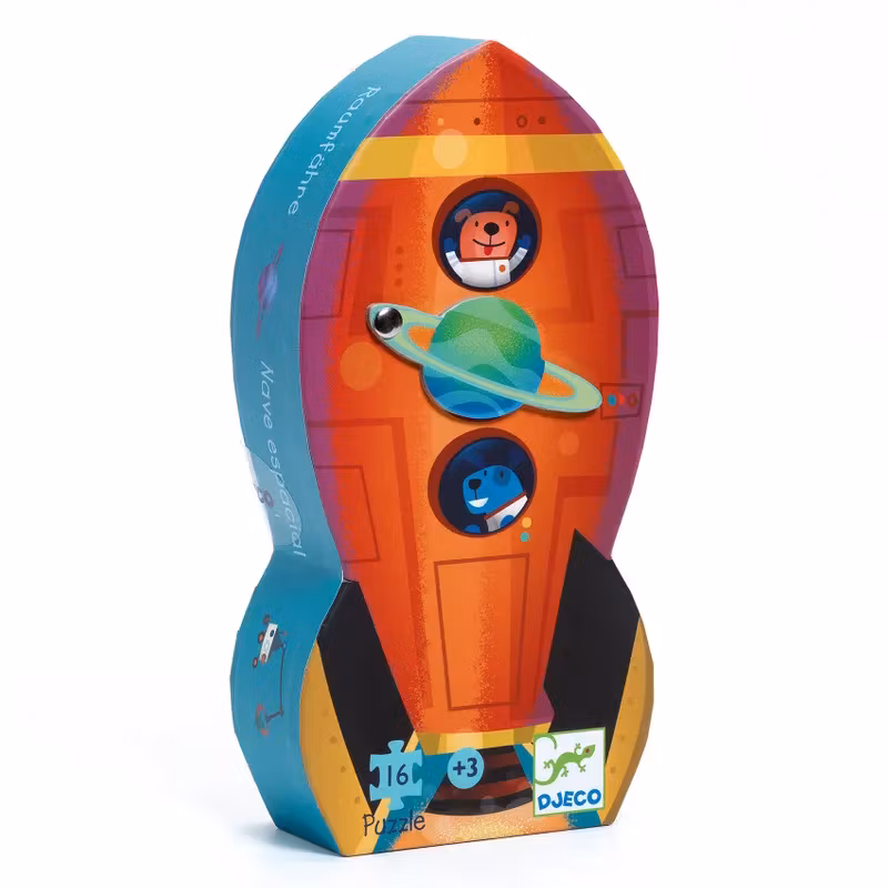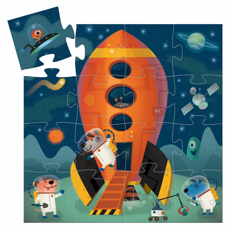 Detta mysiga lilla pussel med charmigt rymdmotiv och fina färger kommer förpackat i en cool låda formad som en rymdraket som även fungerar som dekoration i barnrummet.