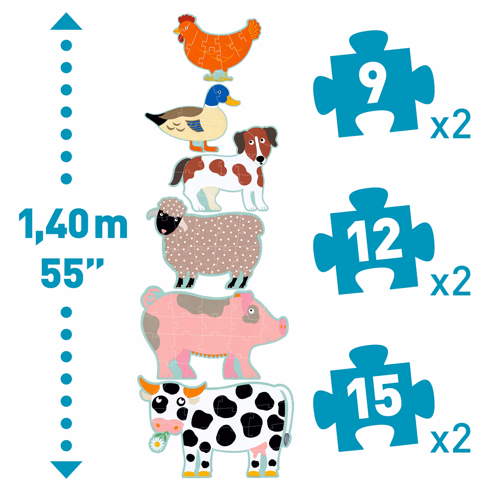 Varje djur består av ett antal pusselbitar: hönan och ankan har 9 bitar, hunden och fåret har 12 bitar och grisen samt kon har 15 bitar - totalt 72 bitar för alla pussel.