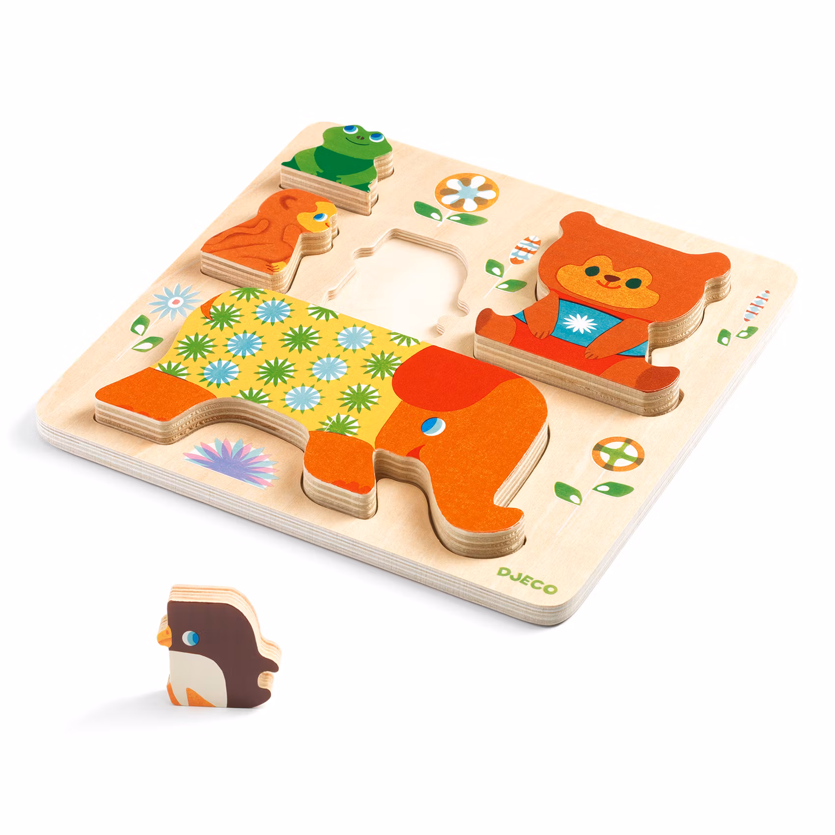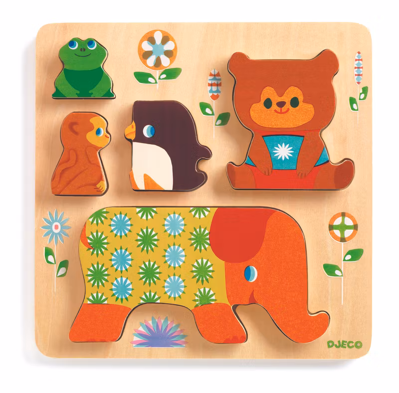 Fint reliefpussel i trä med fem härliga djur i alla möjliga storlekar som alla är enkla att hantera för små händer.