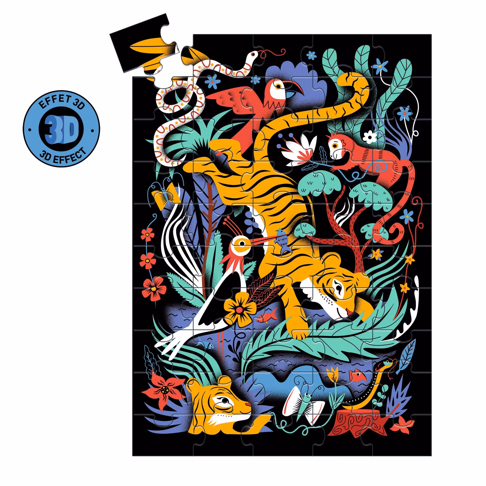 Ett kul 50-bitars pussel med det där lilla extra som gör det speciellt. När du har lagt klar pusslet kan du ta på dig de speciella 3D glasögonen som ingår och får då se det slingrande djungel-motivet framträda i tre dimensioner! Fantastiskt! Pusslet är av hög kvalitet med tjocka bitar som tål att läggas om och om igen samt tillverkas av FSC®️ certifierad kartong och papper. Dessutom är det förpackat i en kul låda med ett annorlunda format.