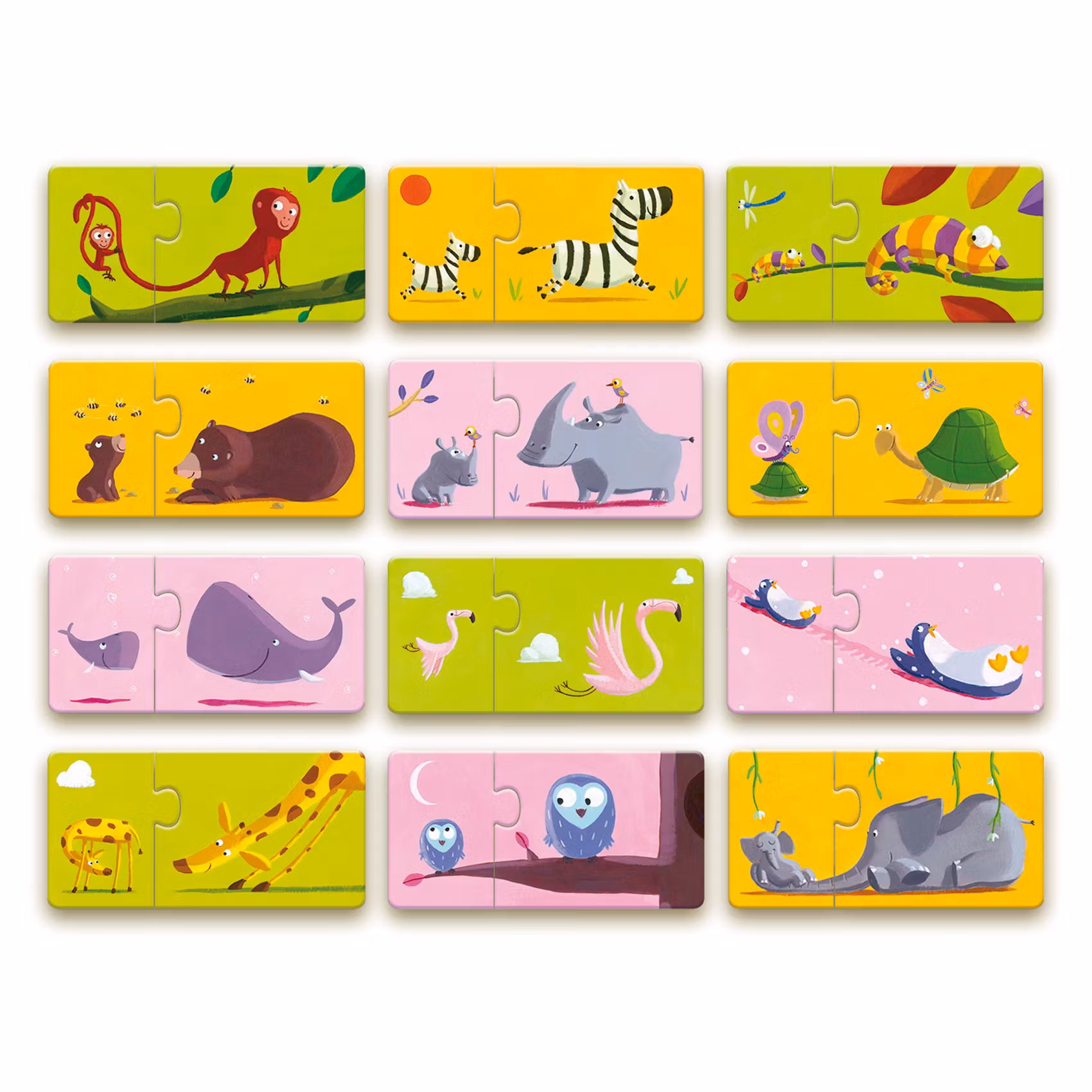 Fint illustrerade små pussel för de minsta. Temat i denna förpackning är mamma och barn, matcha de olika djurmammorna med sina söta ungar, där bakgrundsfärgen ger en ledtråd till vilka bitar som hör ihop.