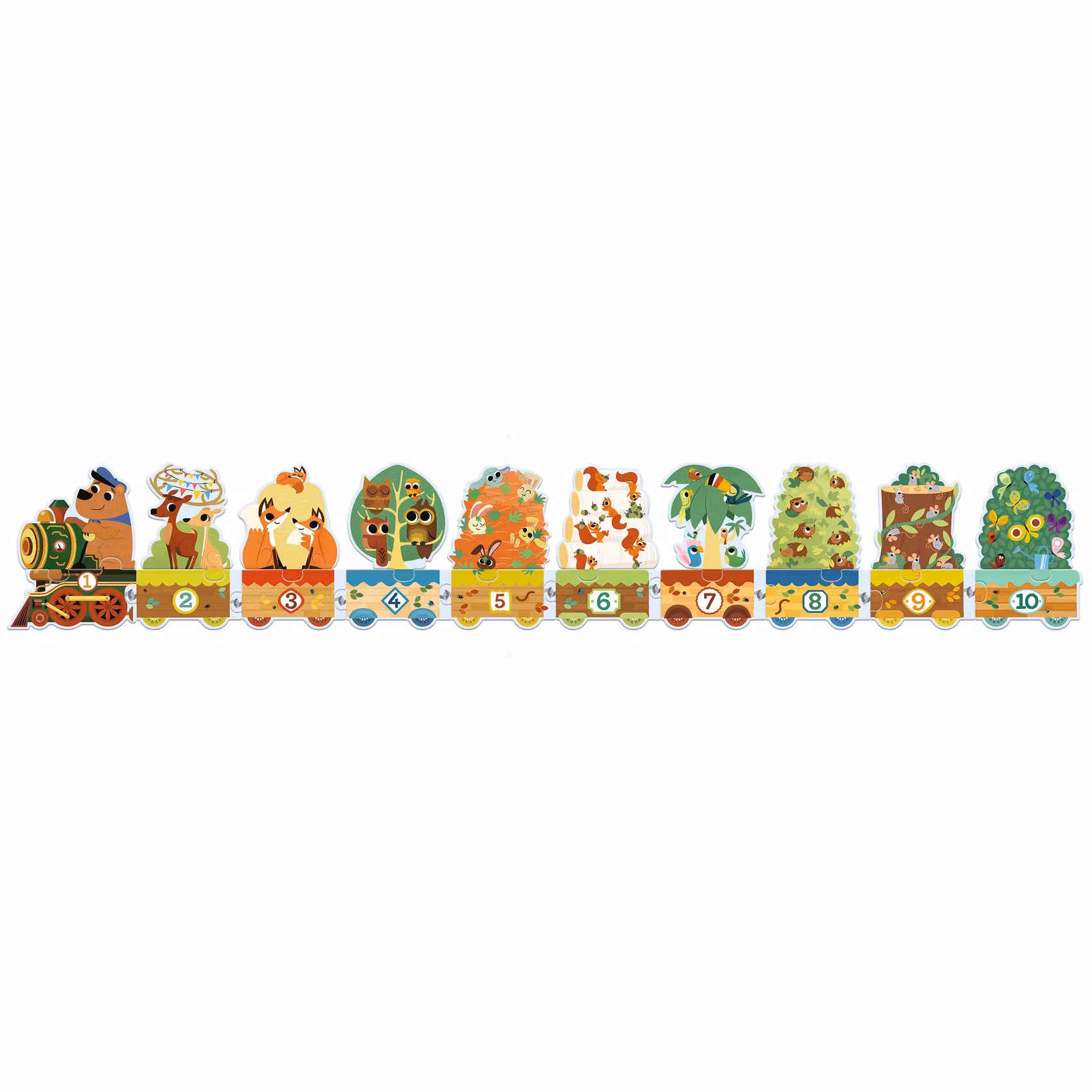 Ett roligt, färggrant och pedagogiskt pussel för de yngre barnen, utformat som ett långt tåg med skogens djur som passagerare och som låter barnet öva på siffror, antal samt numerisk ordning.