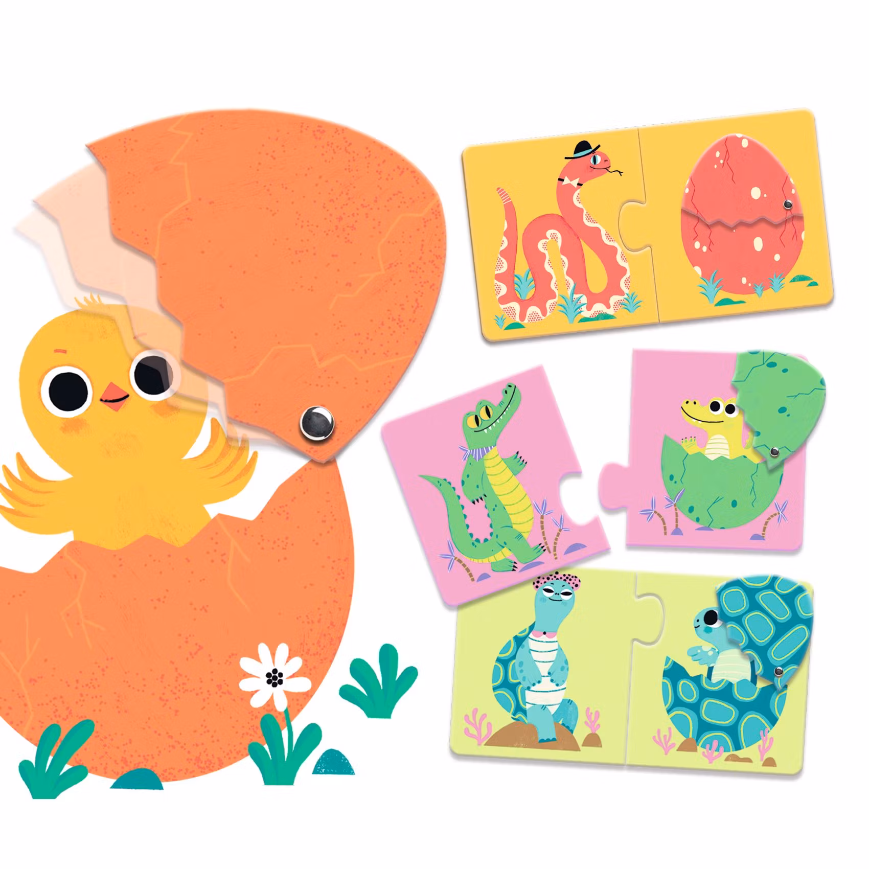 Ett set med sex söta 2-bitars pussel för de yngre barnen där de ska para ihop olika djur med sina ägg med hjälp av äggens (och bakgrundens) färger.