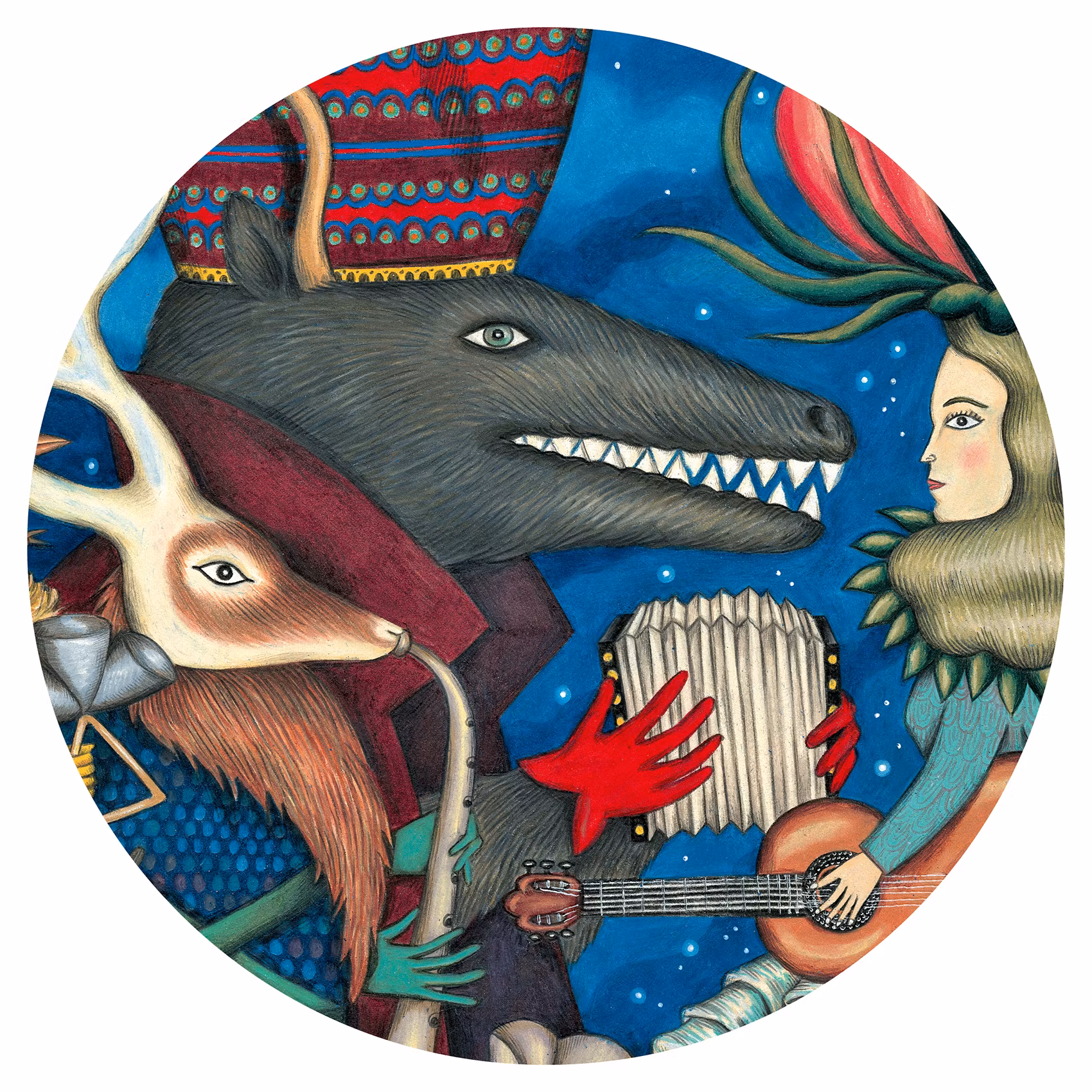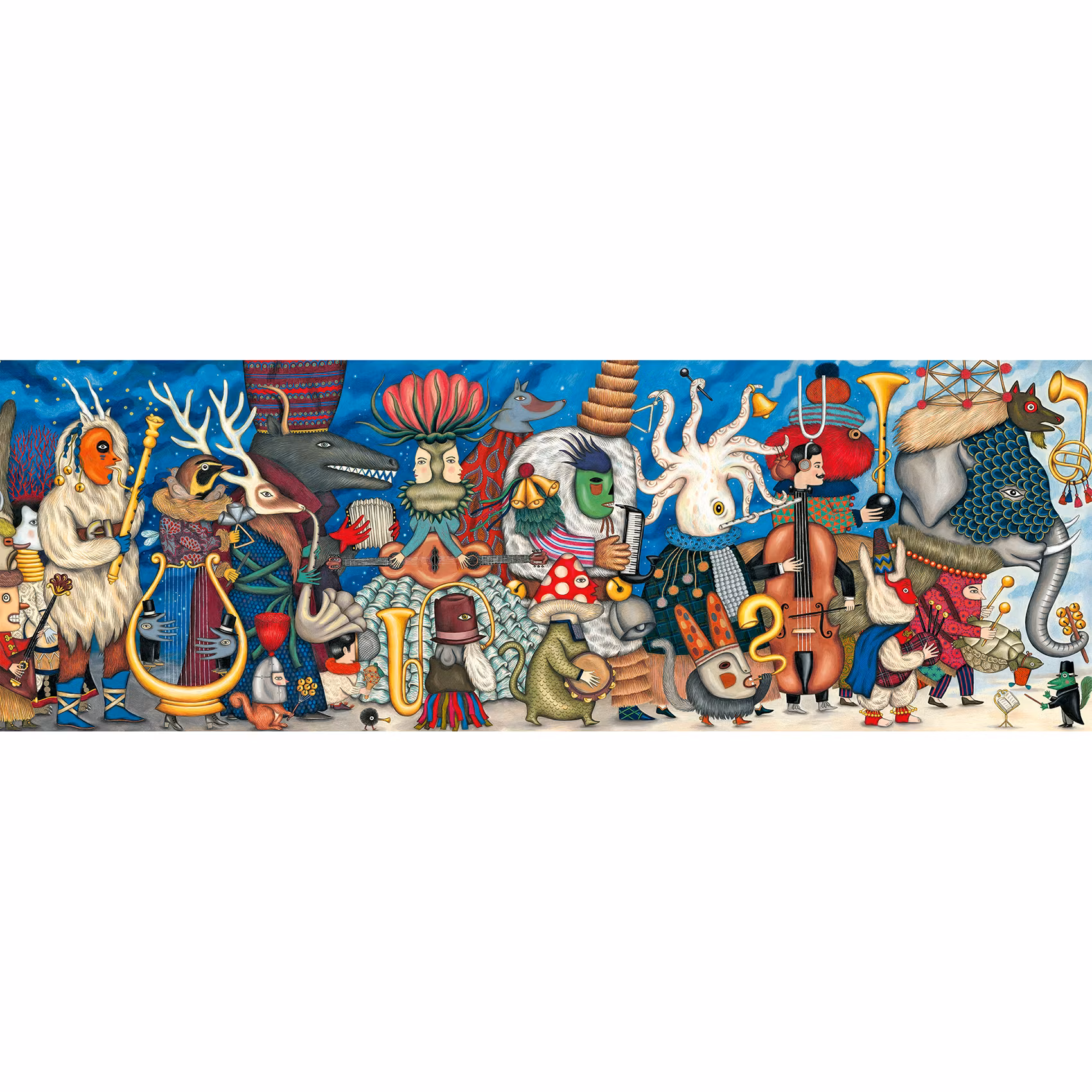Ett pussel med en läckert färgstark och fantasifull orkester med djur och fantastiska vidunder som musiker.
