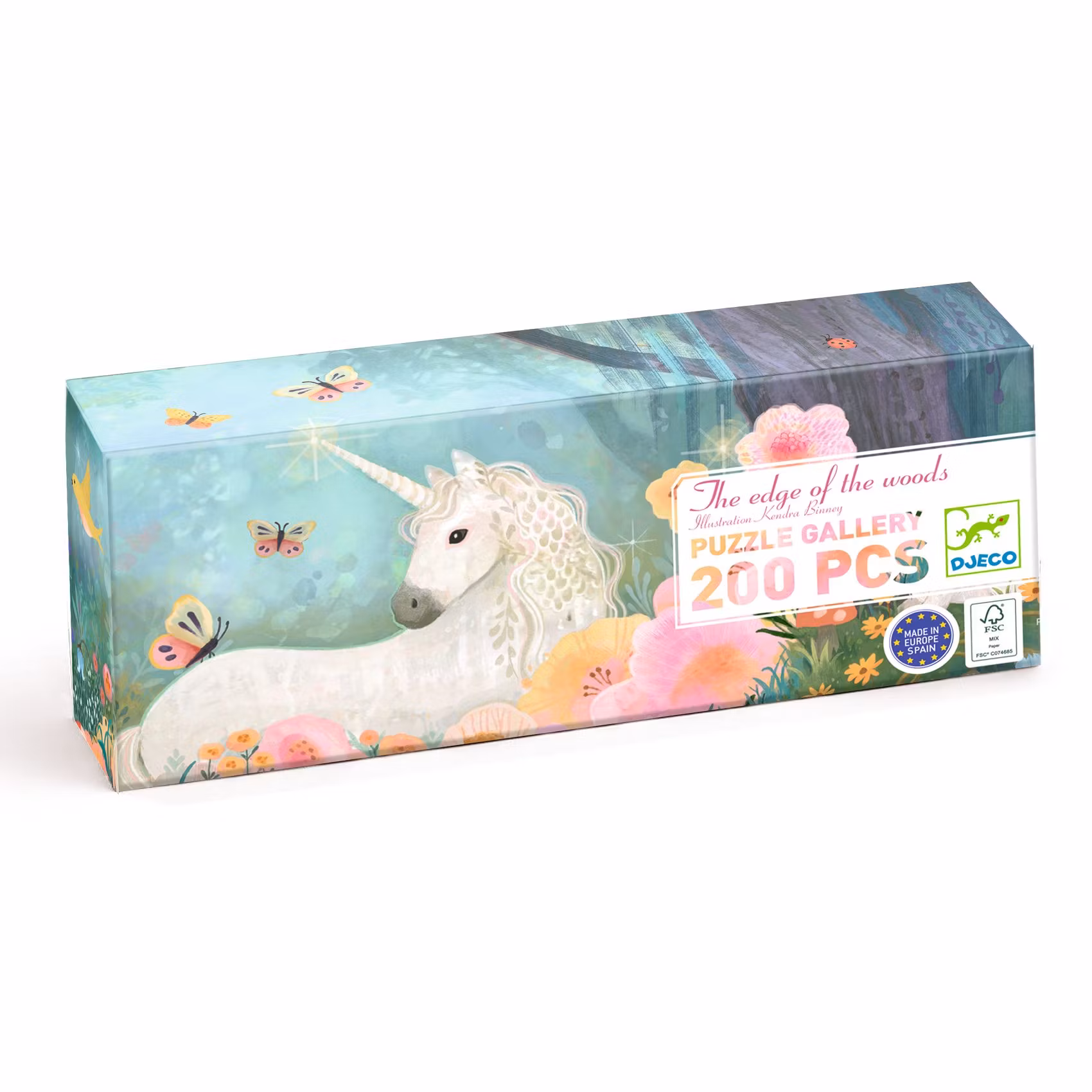 Från +6 år. Detta fascinerande och färgrika 200-bitars pussel har ett ovanligt och extra långsmalt format som både gör det lätt att överblicka och roligt att lägga. Motivet föreställer en magisk scen från en liten glänta i skogens utkant, där en fantastisk enhörning vilar bland blommor och söta djurkompisar. Pusslet är ett roligt sätt att utforska den livfulla och detaljrika illustrationen, fylld med små överraskningar att upptäcka. Ett fantasifullt och originellt sätt för barn att upptäcka och lära sig uppskatta konst och illustrationer. Den dekorativa förvaringsasken är lika färgglad som pusslet och innehåller även en affisch av motivet i naturlig storlek, vilken kan användas som referens när du lägger pusslet, som en slags fusklapp under det, eller helt enkelt som en vacker dekoration att sätta upp på väggen. Pusslet är tillverkat i Europa och håller en hög kvalitet som tål att läggas om och om igen. Innehåll: 200-bitars pussel, 1 affisch, 1 förvaringsask. Storlek på det färdiga pusslet: ca 33 x 97 cm.