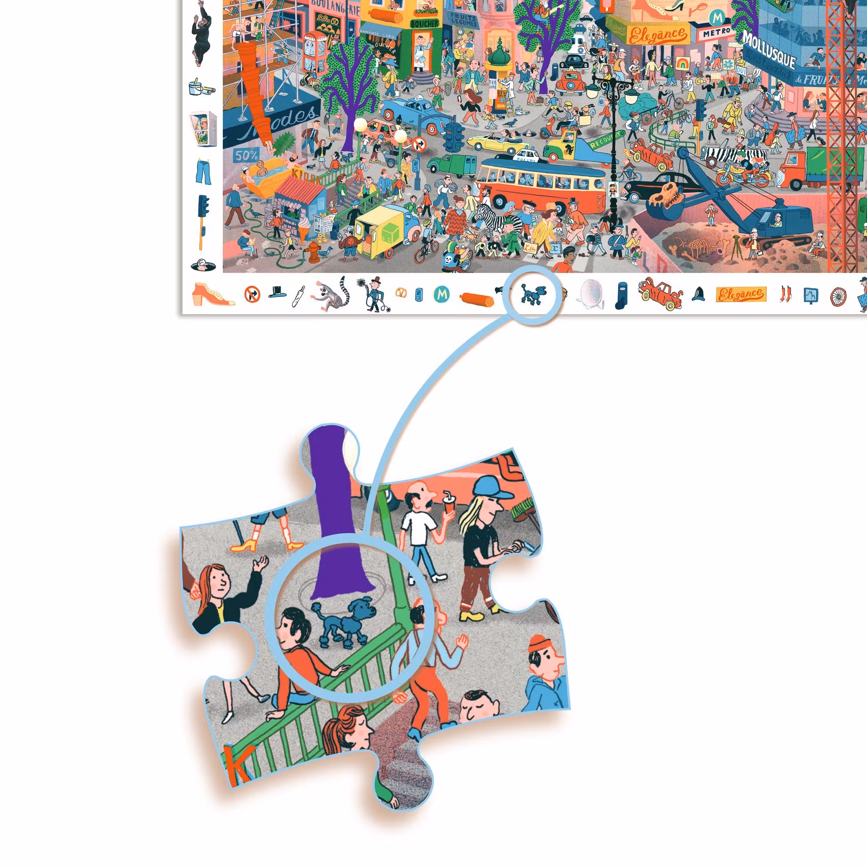 Från +6 år. Ett färgsprakande och härligt detaljrikt 200-bitars observationspussel fyllt av spännande överraskningar. Motivet föreställer en livlig stad fylld med skojiga karaktärer, underhållande scener och djur som har rymt från djurparken och gömt sig lite överallt! När pusslet är färdiglagt väntar dessutom den roliga utmaningen att leta efter alla de föremål som visas i den vita ramen någonstans i huvudbilden. Den medföljande affischen i naturlig storlek kan antingen användas som referens, placeras under pusslet när det läggs som en praktisk "fusklapp", eller sättas upp på väggen som en dekoration. Pusslet är tillverkat i Europa och håller en hög kvalitet, vilket gör att det tål att läggas om och om igen. Innehåll: 200 pusselbitar, 1 affisch av motivet i naturlig storlek, 1 förvaringsask. Storlek på det färdiga pusslet: ca 38 x 61 cm.