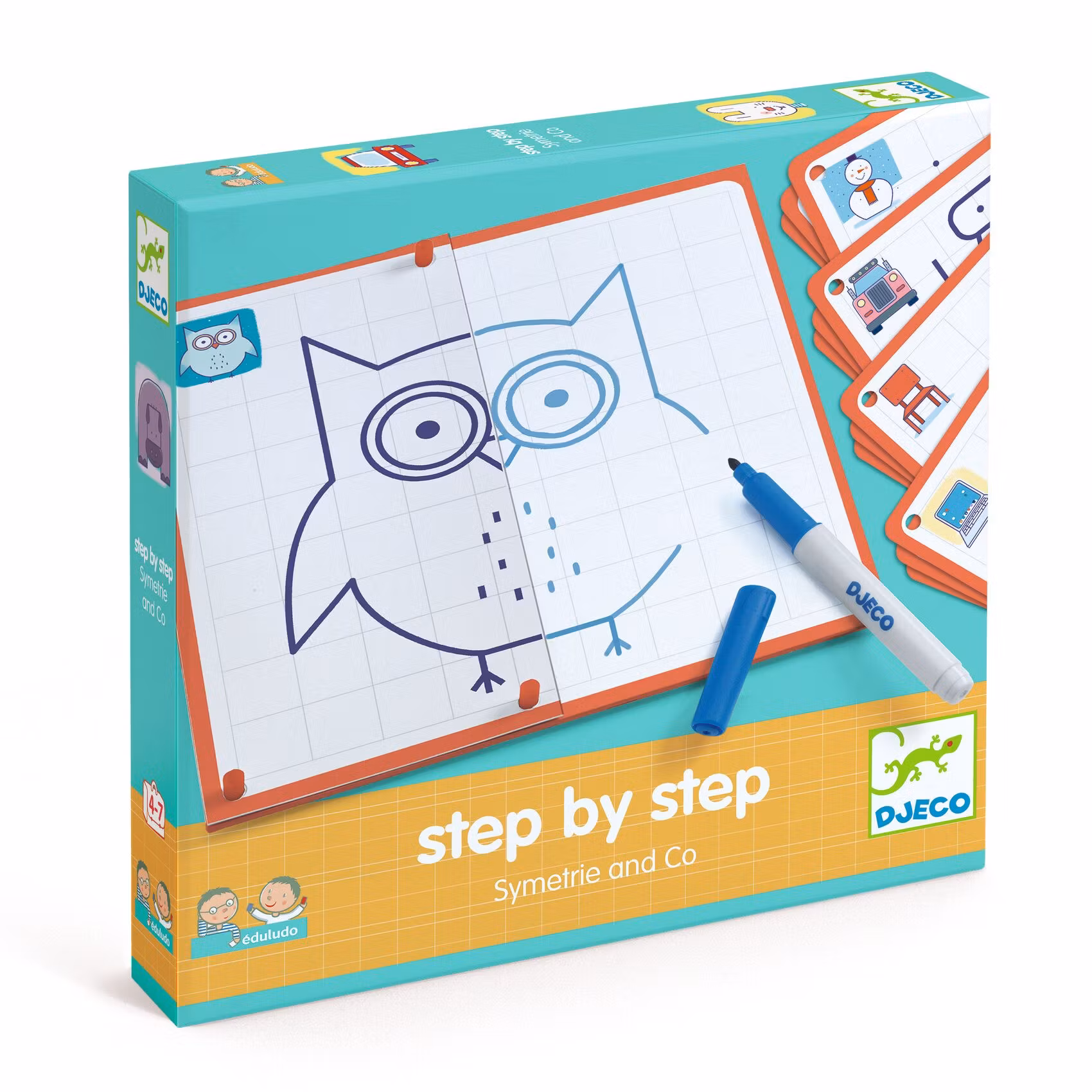 Sätt fast ett kort med mallen på den lilla whiteboard tavlan och använd rutnätet för att försöka lista ut hur du ska rita för att spegelvända den halva bilden och få en helt symmetrisk bild. Korten har hål i alla fyra hörnen som ska träs över de fyra piggarna på whiteboard tavlan och rutnätet gör dessutom att aktiviteten likar uppgifter man kan få i skolan, men kanske med roligare bilder. Whiteboard-pennan som ingår behöver ingen rengöringsvätska för att suddas ut utan kan lätt torkas bort med en torr trasa, vilket gör att det går lätt att rita om bilderna och öva nästan oändligt många gånger.