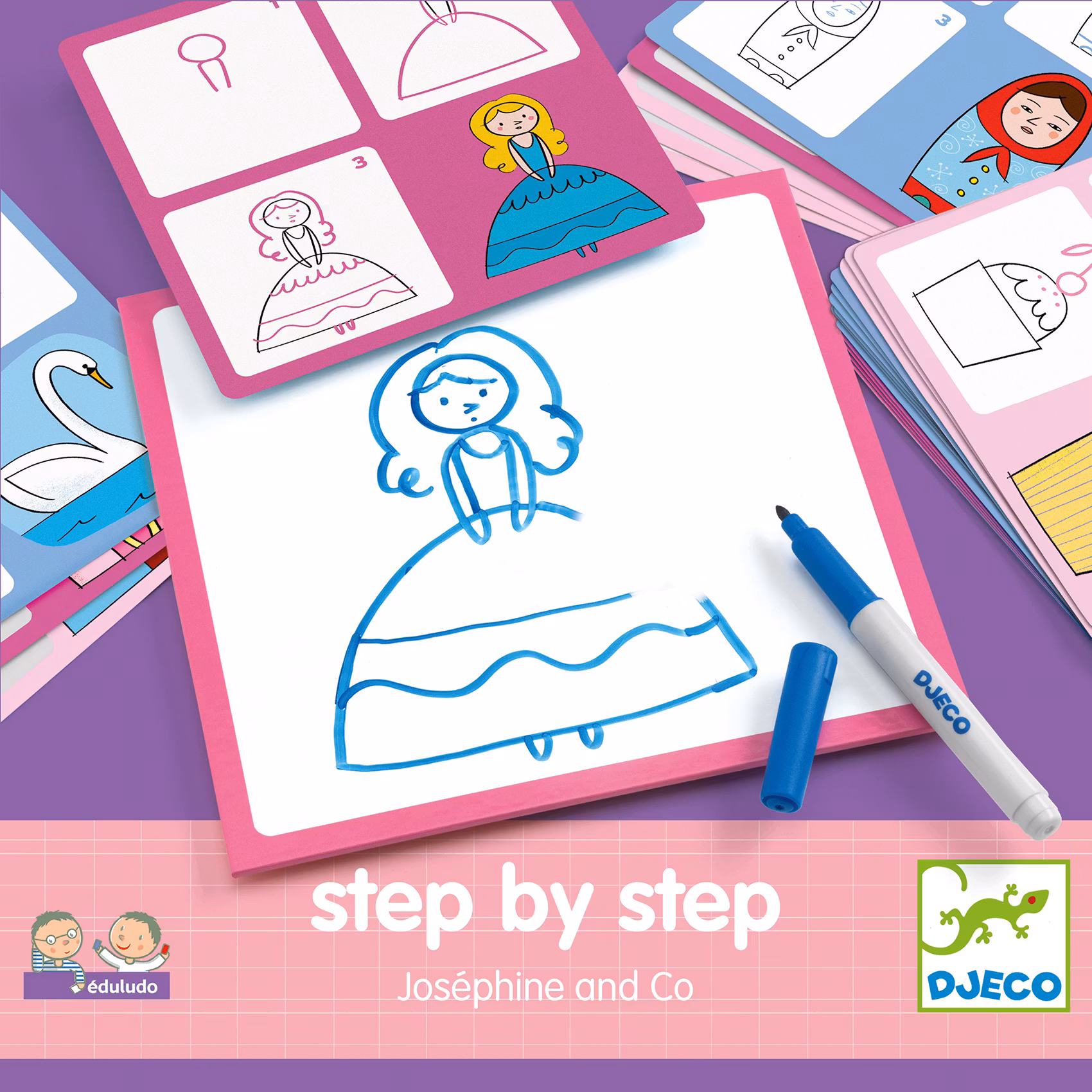 Innehåller: 24 olika kort med motiv och instruktioner, en ritplatta som har suddbar yta, en trasa att sudda med och en raderbar penna.