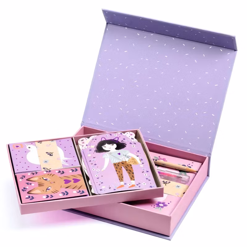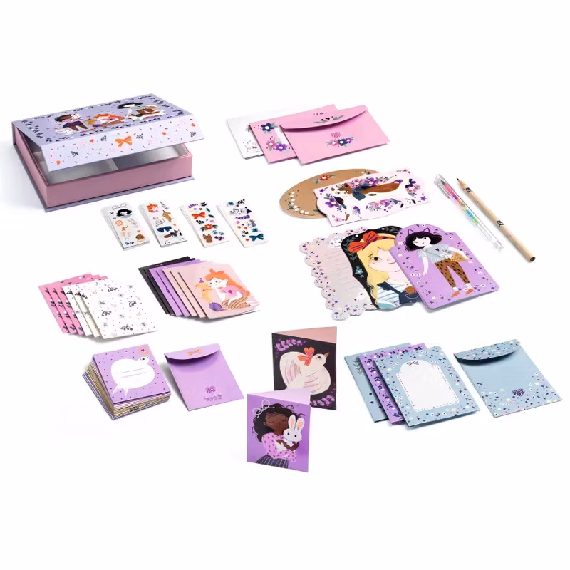 Tillverkat av FSC®️ certifierat papper och kartong. Innehåll: 1 förvaringsask med löstagbart fack (ca 16 x 21 x 4 cm), 15 små dubbelvikta kort (5 olika motiv) med illustrerade kuvert, 15 stora kort (5 olika motiv) med illustrerade kuvert, 10 ark med små dekaler, 10 ark med små klistermärken, 1 gelpenna med regnbågens färger, 1 blyertspenna.