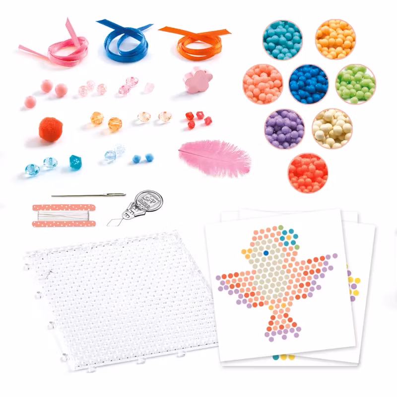 Ett kul nytt pyssel från Djeco där man på en liten special-platta lägger ut magiska pärlor i formen av figurer och sedan sprejar med vatten så att pärlorna aktiveras och fastnar vid varandra. Det ingår också material för att göra hängen av de färdiga figurerna av en katt, en räv och en fågel.