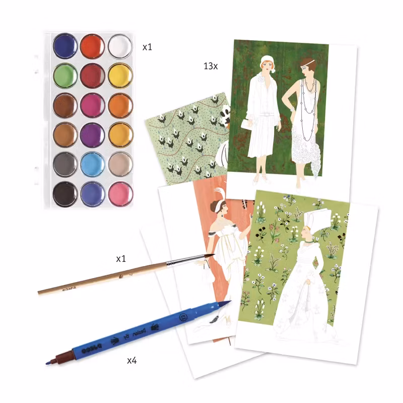Setet innehåller en ask med 18 vattenfärger, pensel, 4 tuschpennor och 13 kort med klänningar att färglägga.