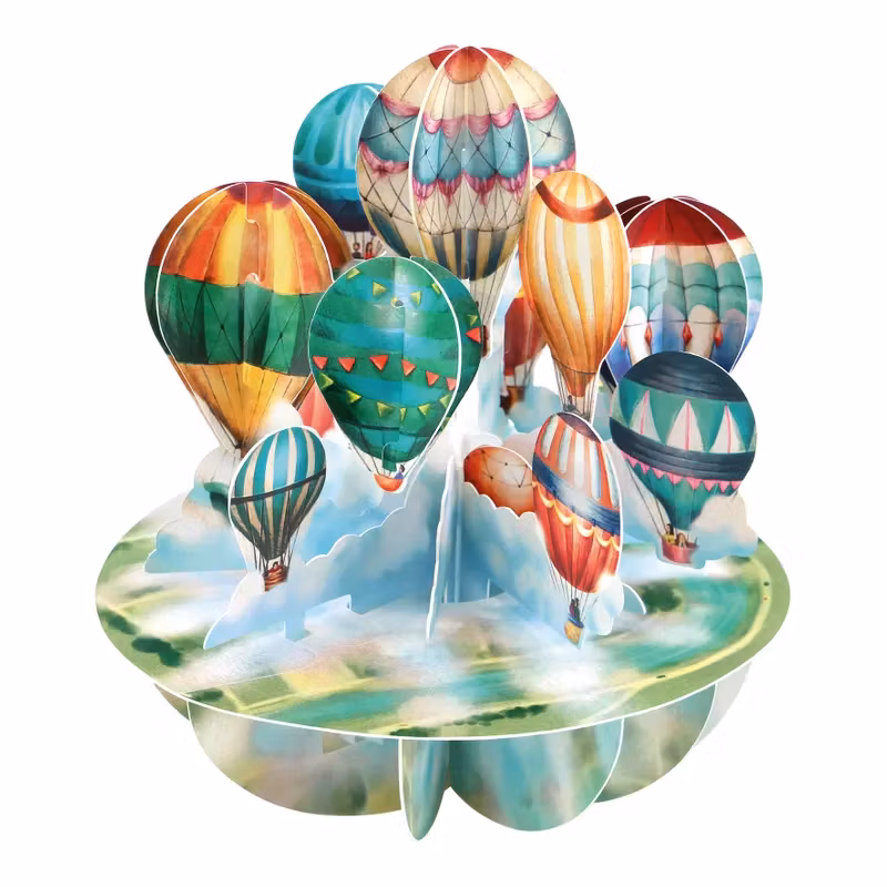 Varje kort packas platt och öppnas för att bilda en 3D-skulptur med rörliga delar och plats för meddelande.
