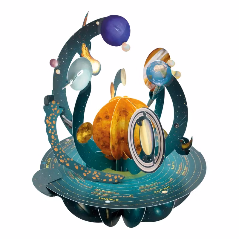 Varje kort packas platt och öppnas för att bilda en 3D-skulptur med rörliga delar och plats för meddelande.