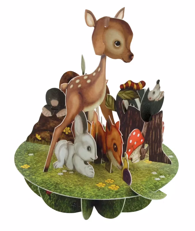 Varje kort packas platt och öppnas för att bilda en 3D-skulptur med rörliga delar och plats för meddelande.