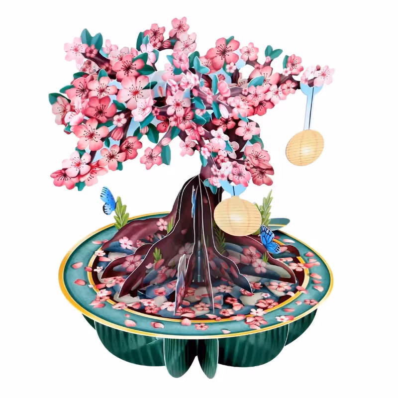 Varje kort packas platt och öppnas för att bilda en 3D-skulptur med rörliga delar och plats för meddelande.