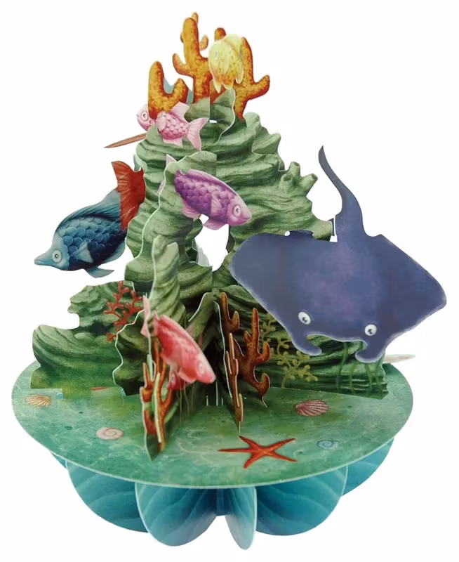 Varje kort packas platt och öppnas för att bilda en 3D-skulptur med rörliga delar och plats för meddelande.