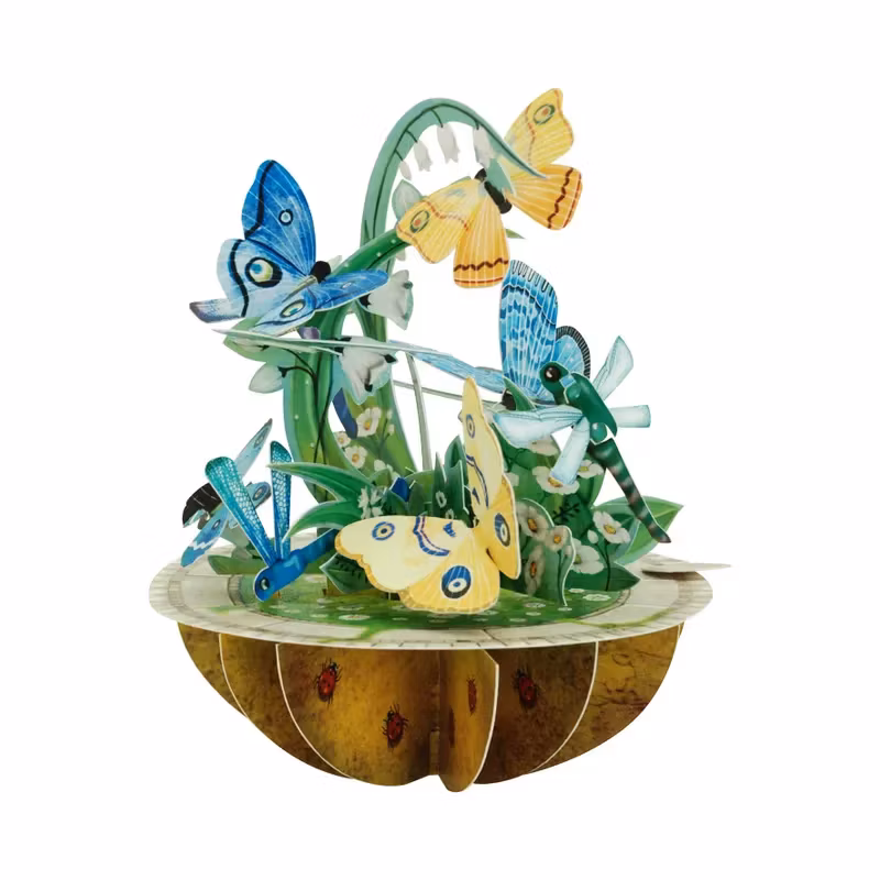 Varje kort packas platt och öppnas för att bilda en 3D-skulptur med rörliga delar och plats för meddelande.