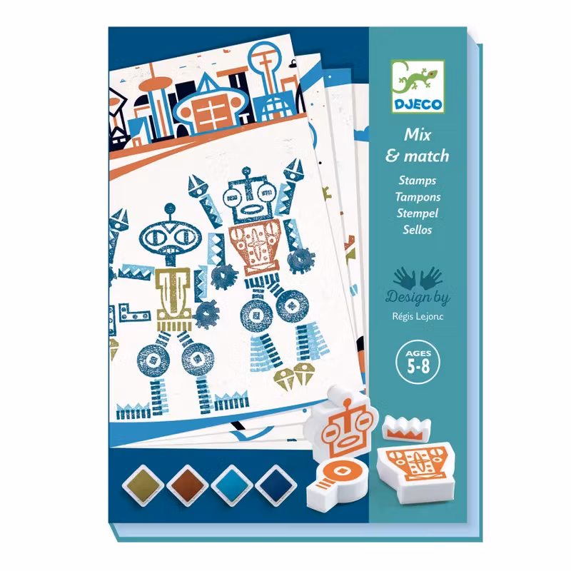 Med fyra olika färger och 14 olika stämplar med robot-delar att välja mellan kan du låta din fantasi och påhittighet få fritt spelrum medan du skapar snygga bilder på robotar som passar till landskapet på de medföljande korten.