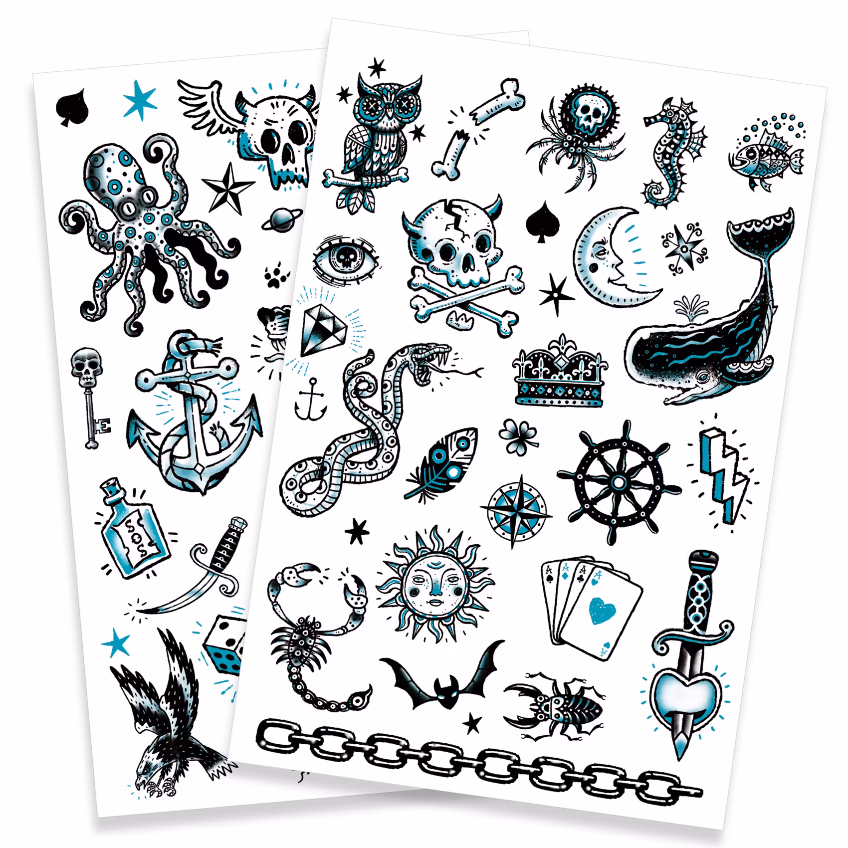 Coola tatueringar i blått, svart och vitt med lite tuffare motiv så som döskallar, sabel och ettriga vargar. Dermatologiskt testade. Förpackningen innehåller 2 ark med tatueringar.